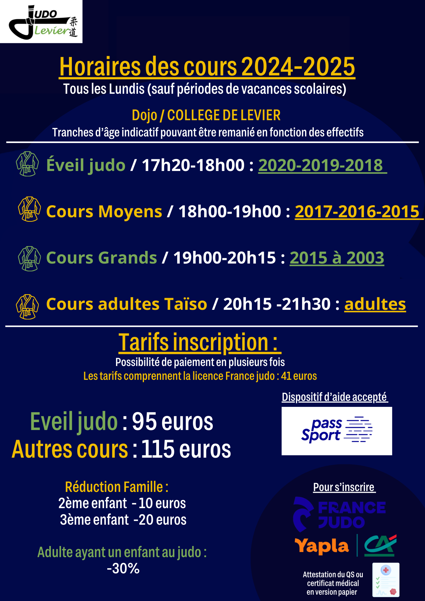 Les cours sont assurés le lundi et le vendredi (cours Katas/perfectionnement) et encadrés par M. Olivier Marlot professeur diplômés d'Etat.